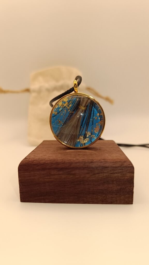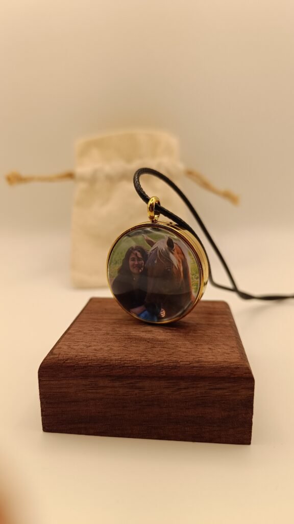 Un médaillon souvenir avec d’un côté la photo de votre choix et de l’autre quelques uns de ses crins mis en valeur.