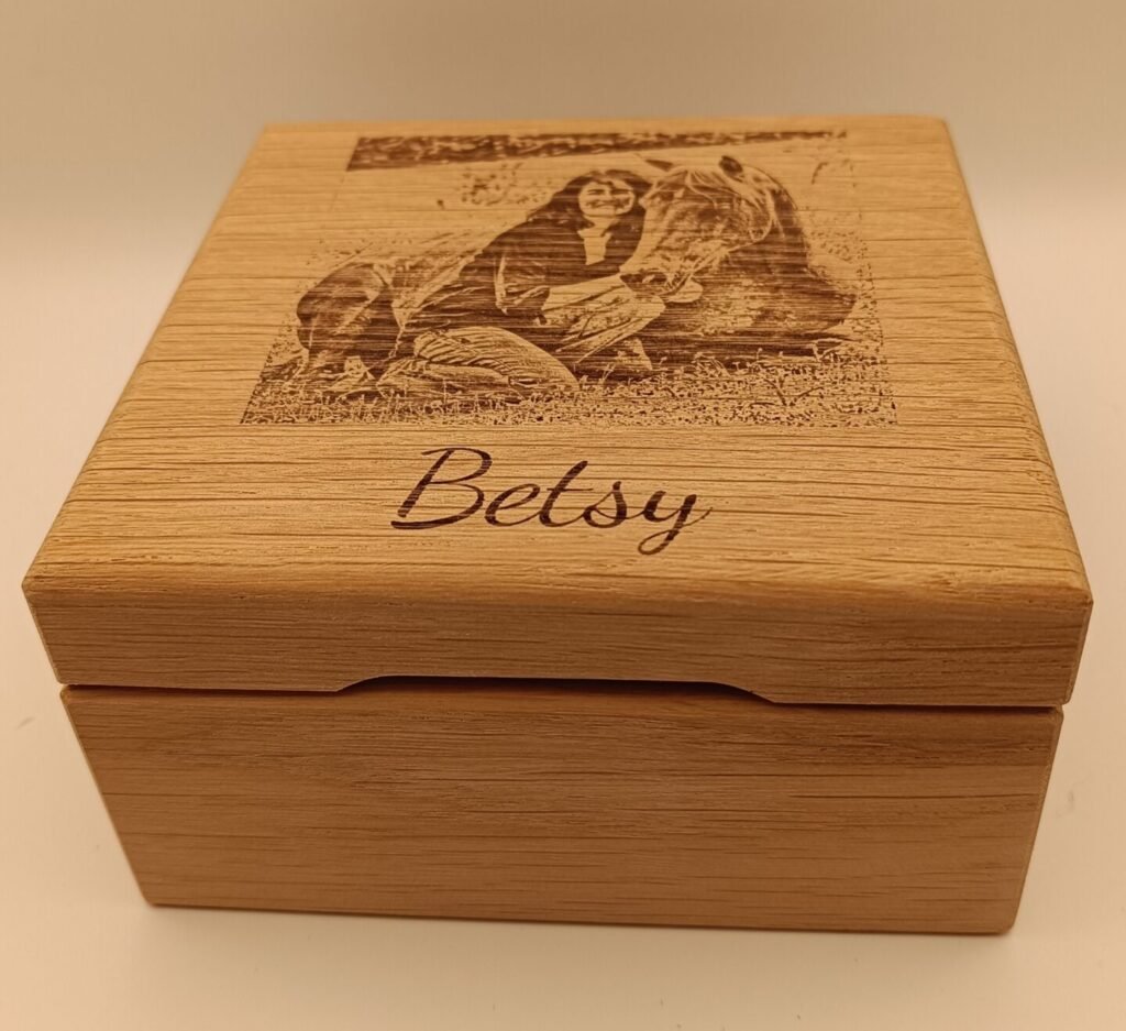 Entreposé dans un coffret en chêne massif, réalisé à 100 % en France avec du bois certifié, sur lequel est gravée la photo de votre choix avec le nom de votre cheval.